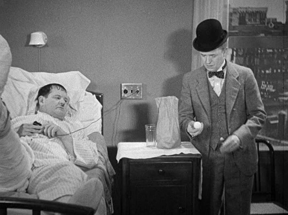 Stan and Ollie employ eggs in a ploy to shanghai sailors in The Live Ghost (1934).