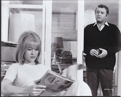 Three Into Two Won't Go (1969) addresses two adultery film tropes: the midlife crisis and the interloper. Steve Howard (Rod Steiger), a middle-aged sales executive, becomes captivated by a teenage hitchhiker, Ella Patterson (Judy Geeson). The couple stops at a hotel for sex. Weeks later, Ella turns up at the Howards' home pregnant and tells Steve that he is the father. Steve, who has been unable to have a child with his wife Frances (Claire Bloom), is surprisingly excited by Ella's pregnancy. But it turns out that Ella isn't pregnant. Did she lie or did she lose the baby? This point is never made clear. Frances tells Steve that she never loved him and leaves him. Ella despises Steve for his blustery and controlling nature and rejects him when he turns to her for comfort.